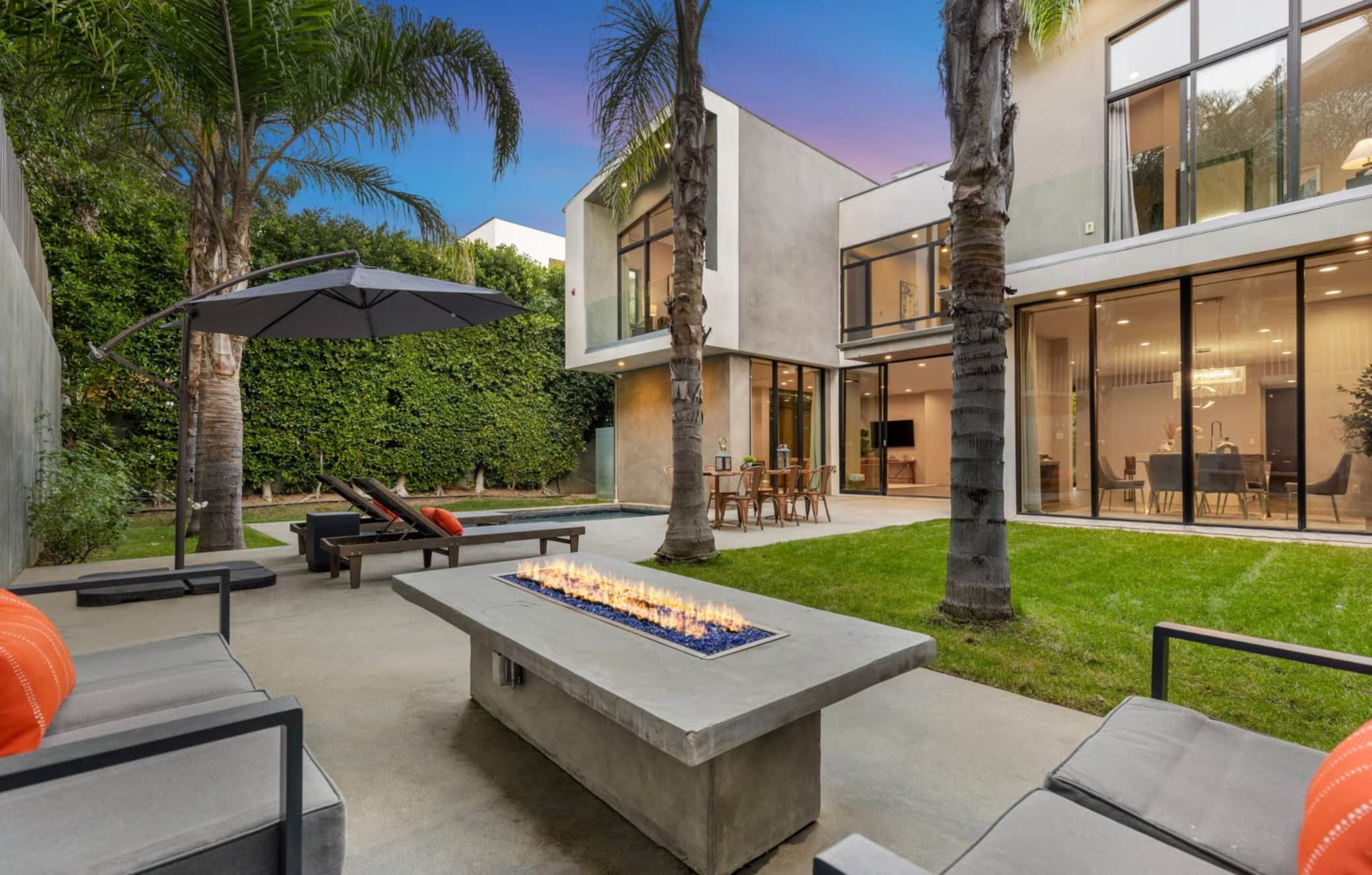 The exteriors feature a private, lushly landscaped backyard complete with a heated pool, sun loungers, an outdoor lounge area with fire pit, and an al fresco dining area. Guests are sure to enjoy the peaceful ambiance of the surrounding canyon while being in one of the most desirable neighborhoods in LA. Whether you're enjoying a sunset soak or hosting an elegant outdoor gathering, this villa is an ideal base for experiencing the best of Beverly Hills.
