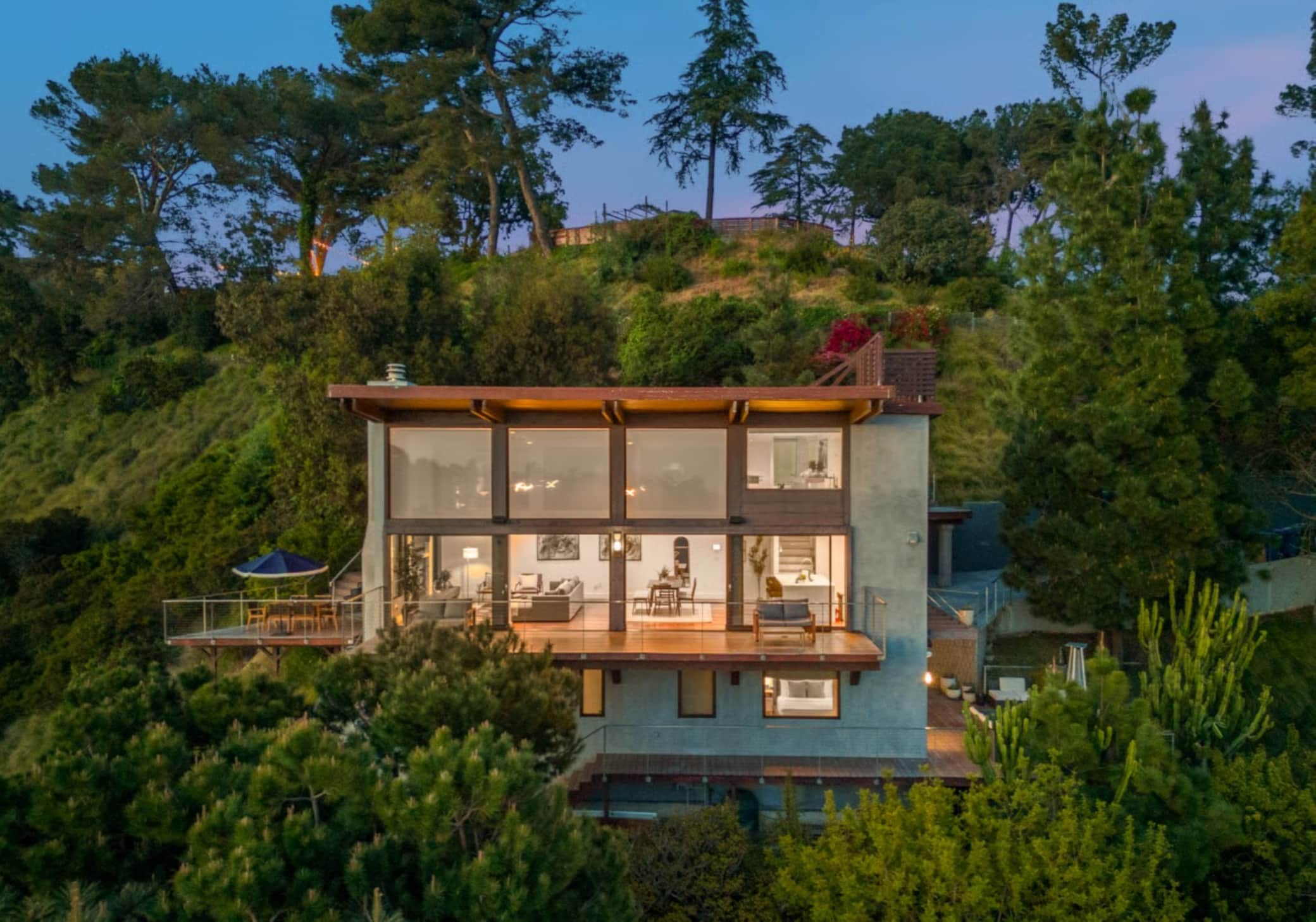 The home is set across multiple levels. The interiors include a spacious main living room with a marble-accented fireplace, a modern chef’s kitchen with a center island, and a dining area, all of which open onto a spacious terrace with beautiful views. There are also a total of four bedrooms and five bathrooms, including a lavish primary suite with a spa-inspired en-suite bathroom, walk-in closet, and access to a private terrace with uninterrupted city views.