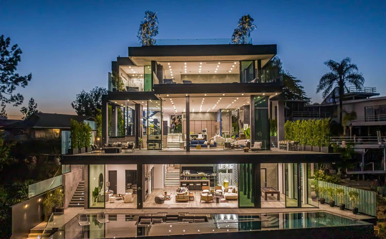 The home is set over various levels. Inside, the layout includes multiple lounge areas, a formal dining room, and a fully equipped chef’s kitchen with top-of-the-line appliances. The property features six spacious bedrooms and eleven bathrooms, including a lavish primary suite with its own sitting area, spa-style bathroom, and walk-in closet. A home movie theater, fitness area, and office add to the home’s full-service luxury experience, while the elevator provides convenient access to every floor.