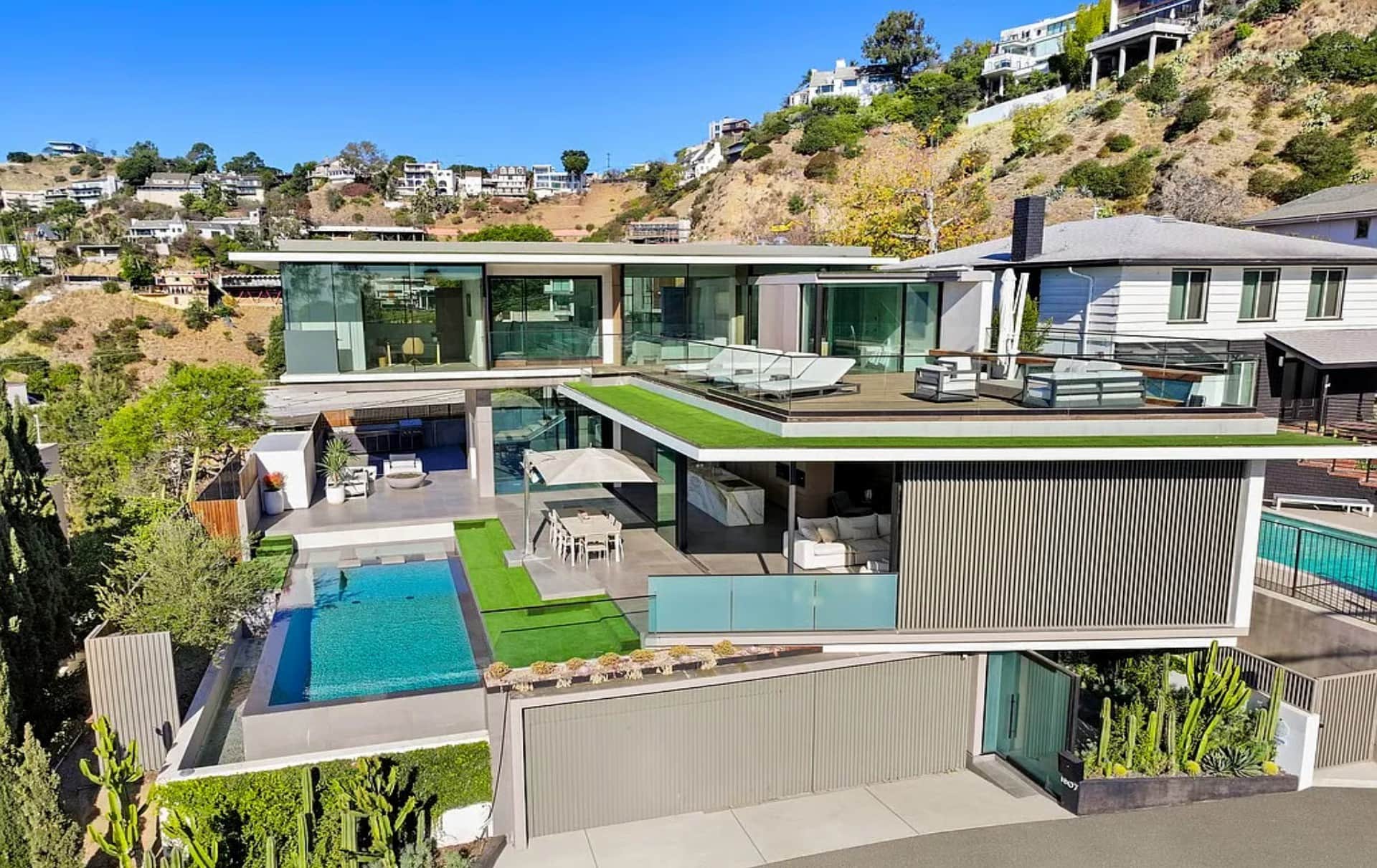 Set across two levels, the home offers an elevated living experience above the city. The lower floor features two spacious en-suite bedrooms, a state-of-the-art home theater, a chic lounge area with a bar, and a laundry room. The upper level features open-plan living and dining areas, a fully equipped kitchen with a breakfast island and seamless access to the pool area, and the primary suite, complete with a spa-inspired bathroom featuring a soaking tub, a walk-in closet, and direct access to a private terrace. Every room is thoughtfully designed to maximize comfort and the villa’s elevated Hollywood Hills setting.