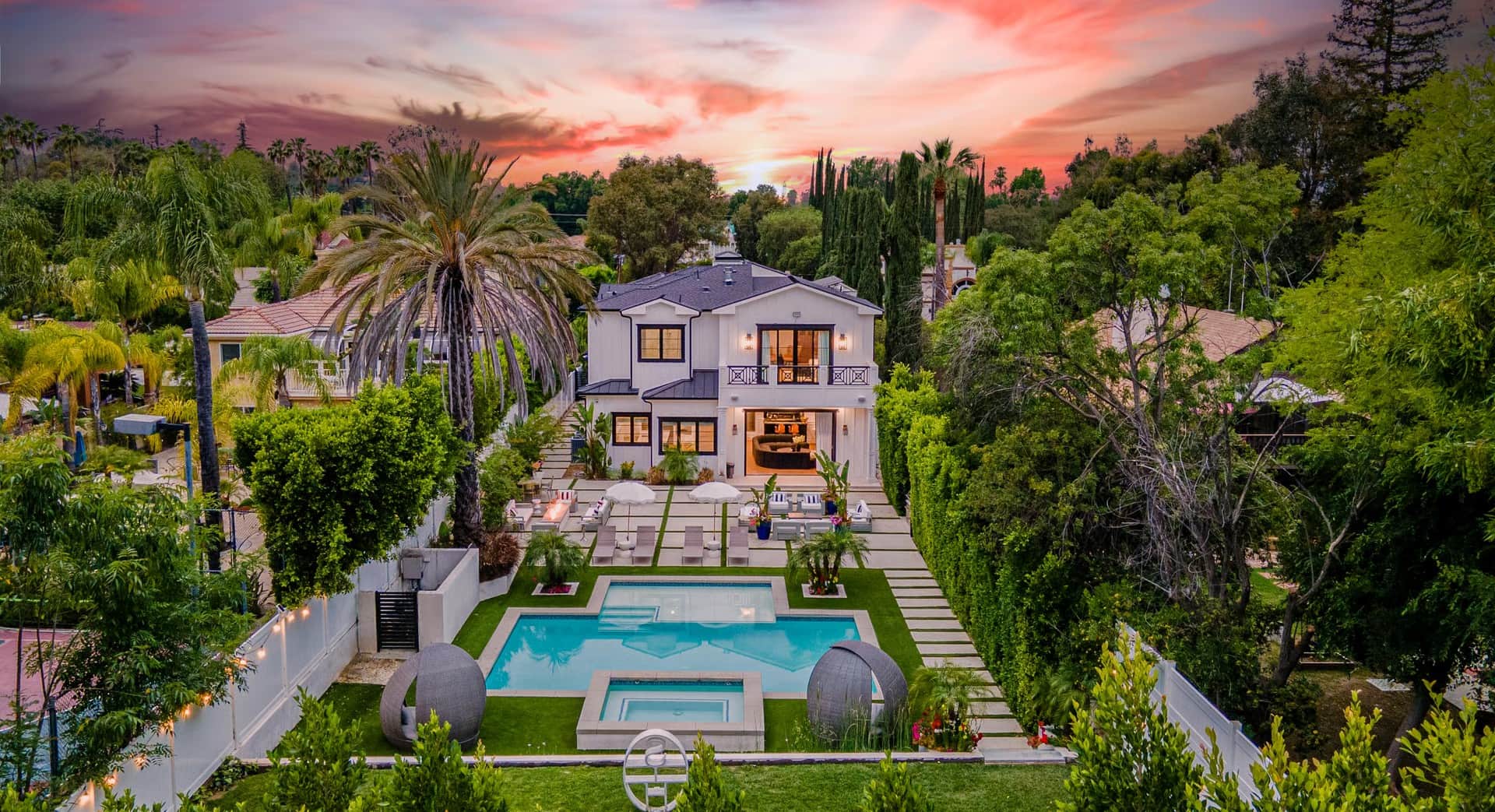The exteriors feature a private backyard oasis complete with a heated pool, a built-in hot tub, and sun loungers set against lush greenery. An outdoor lounge with fire pit and dining area provide the perfect setting for al fresco meals or evening cocktails. Guests can also enjoy the fenced-in privacy of the home’s tranquil lot and the convenience of being just minutes from Tarzana’s vibrant town center.