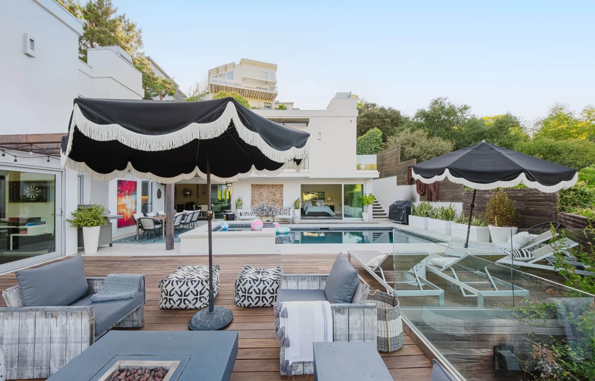 Nestled in the renowned Hollywood Hills, this luxury villa rental is conveniently located only a 9-minute drive from West Hollywood and approximately a 35-minute drive from the pristine beaches of Santa Monica. Standout features include a private heated pool, a hot tub, and multiple lounge areas offering panoramic views. Whether you’re hosting guests or simply seeking a peaceful retreat, this property seamlessly combines luxury, comfort, and convenience.